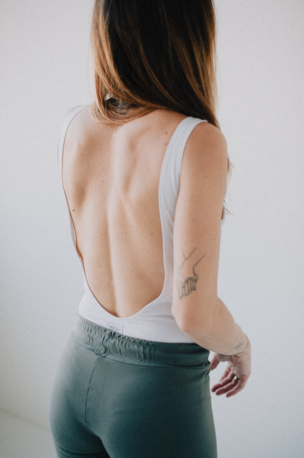 Light as breath, open as sky. Aura is a statement of softness and strength—a white body with an elegant open back, designed to move freely and reveal your radiance.